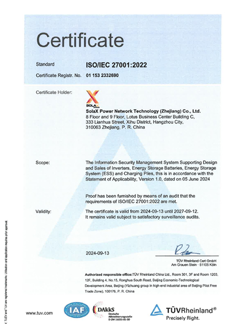 تحافظ سولاكس على أعلى المعايير في إدارة الجودة والسلامة والموثوقية من خلال شهادات معترف بها دوليا. تضمن أنظمتنا الصارمة لمراقبة الجودة أن كل منتج يلتزم باللوائح الصناعية الصارمة وتوقعات العملاء. وبالتزامنا بالتميز، تقدم SolaX حلول طاقة شمسية عالية الأداء وموثوقة لمستقبل مستدام.